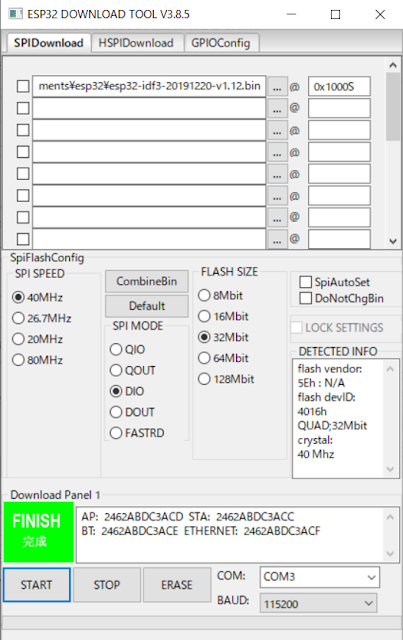 esptool --chip esp32 --port COM3 write_flash -z 0x1000 esp32-idf3-20191220-v1.12.binすんなり書き込みが終わりました。